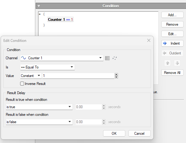 In the Pages tab, click on any page other than Page 0 to show the Condition window, this is where the conditions that control when a page is displayed are set. In here, Add and new condition or Edit the existing condition to read as Counter 1 == 1 for the first Page, and then increment up on the subsequent pages.