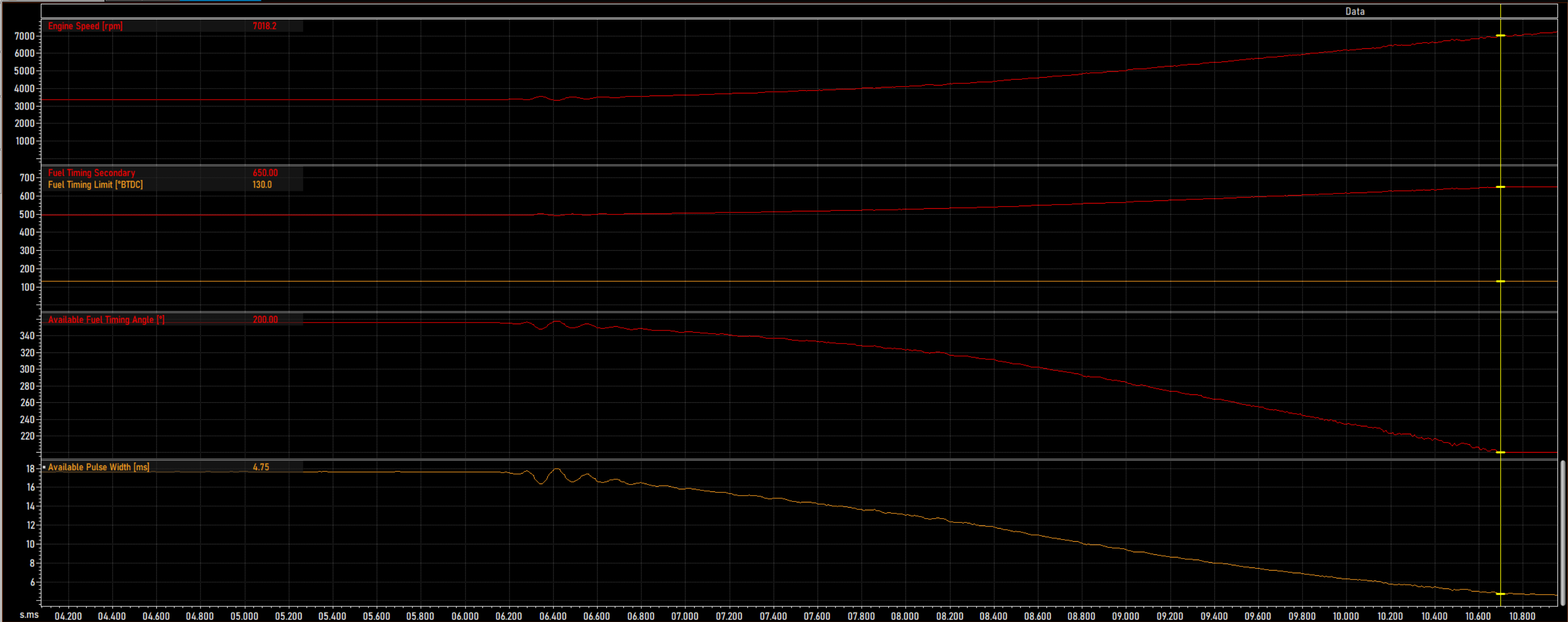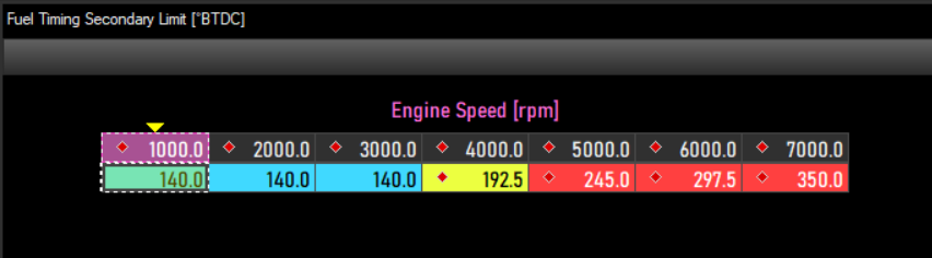 You are aiming for 650° BTDC to end your injection from the injector. Your timing limit is 130°.