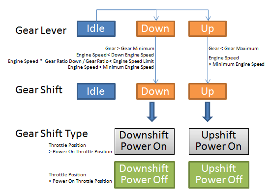 - Engine Speed is smaller than Gear Shift Down Engine Speed, which defines the maximum engine speed for each gear and is used to prevent over-revving on down shifts