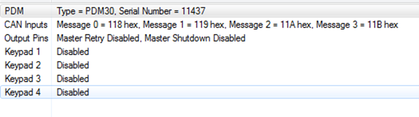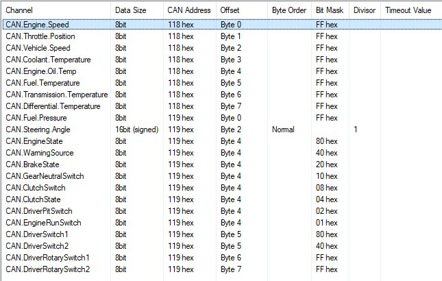 The order that the CAN Channels are listed in this template is the same order as they are received by the PDM, and for ease of support it is recommended that they are left in this order. Changing any of the Data Size, CAN Address, Offset, Byte Order, Bit Mask, Divisor or Timeout Value settings will result in the communications template no longer working.