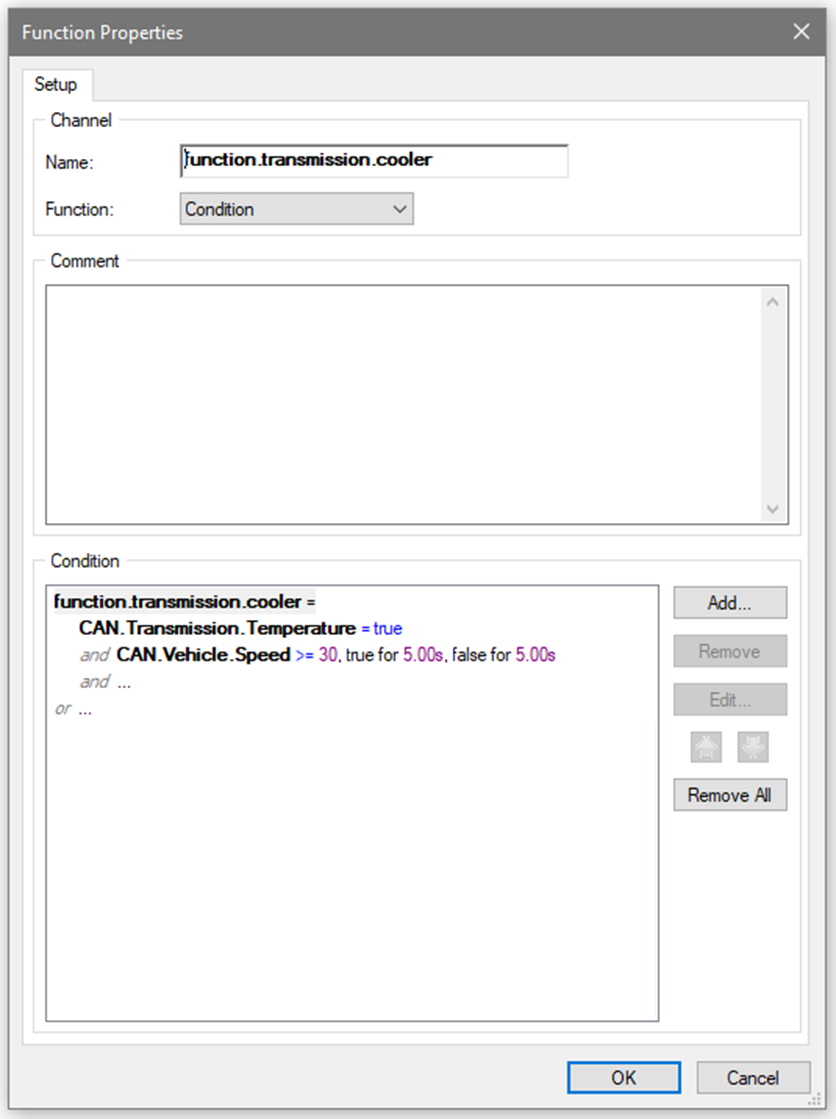 This is a function setup to drive a transmission cooler pump; the transmission pump function in the M1 has a temperature hysteresis function, and is used in this example, which is why the CAN.Transmission.Temperature condition is a simple condition switch. The use of CAN.Vehicle.Speed as another condition that needs to be true for the PDM output to switch to active, in this function it is set that the pump will not turn on until the CAN.Transmission.Temperature condition is active, and the CAN.Vehicle.Speed has been greater than 30 for 5 seconds.
