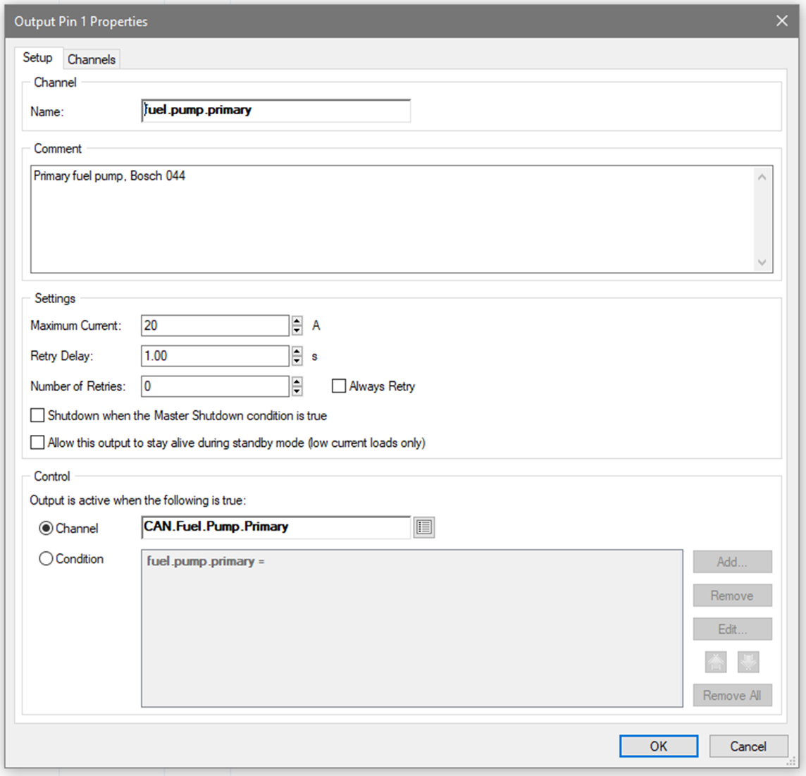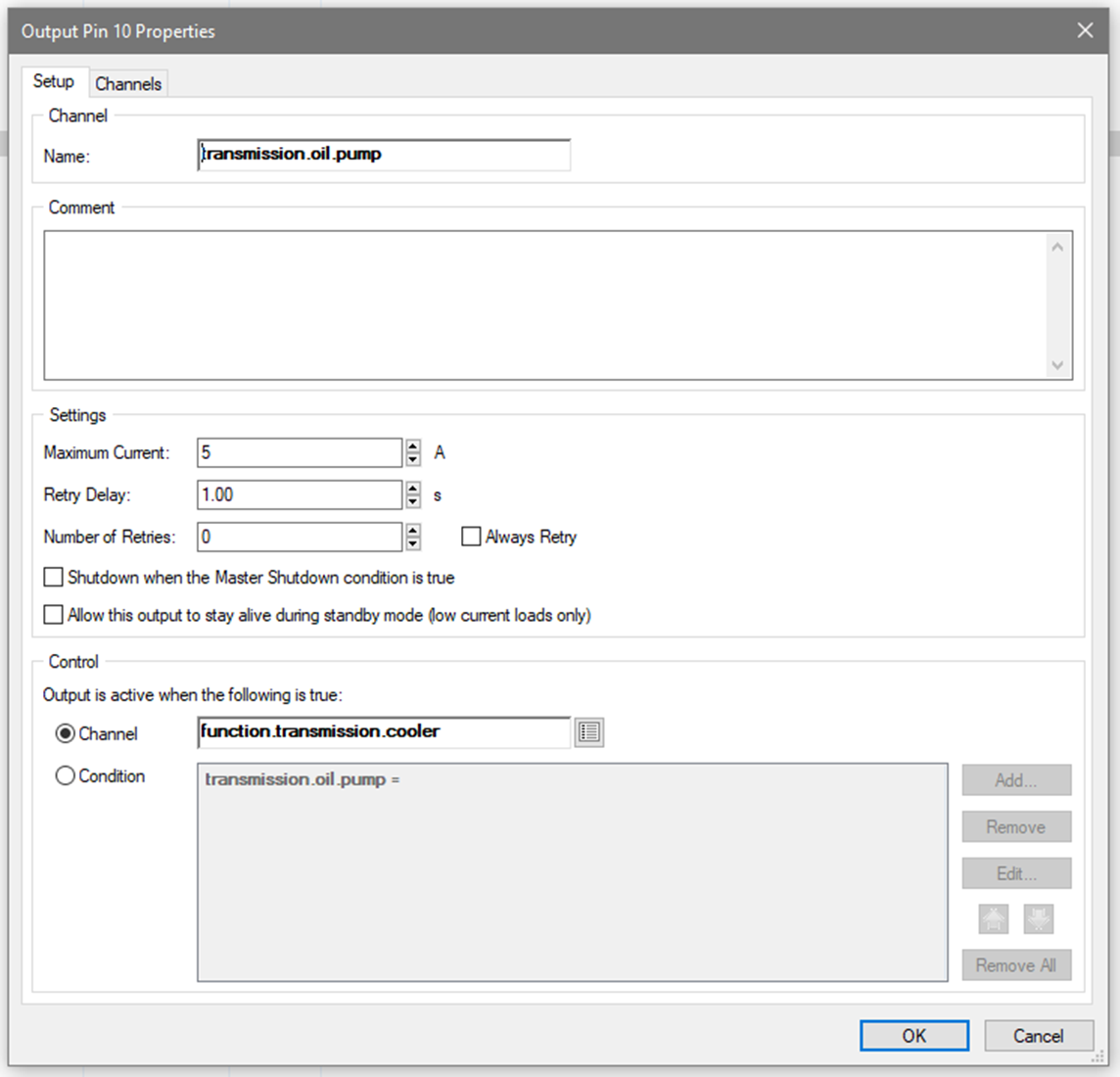 The output properties are setup in the same manner as a directly controlled output, this time using the function output as the control channel rather than the CAN channel.