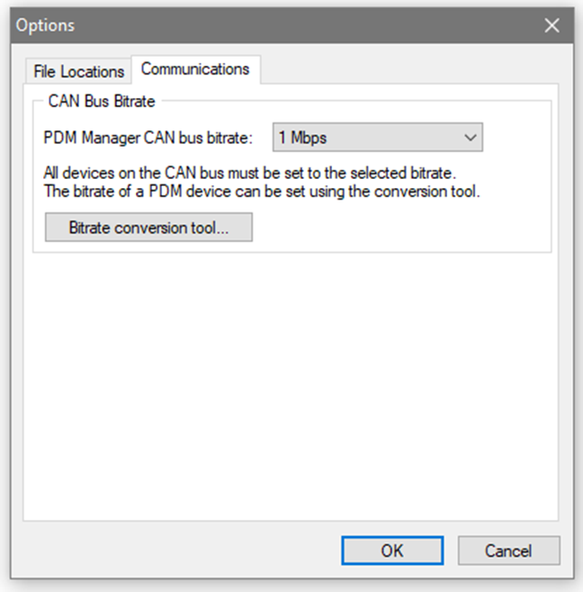 The CAN Bus bitrate must be set to match the bitrate used on all other devices on the CAN Bus. This is done through the Tools | Options | Communications drop down menu.
