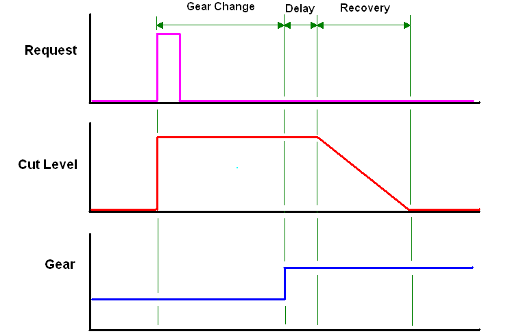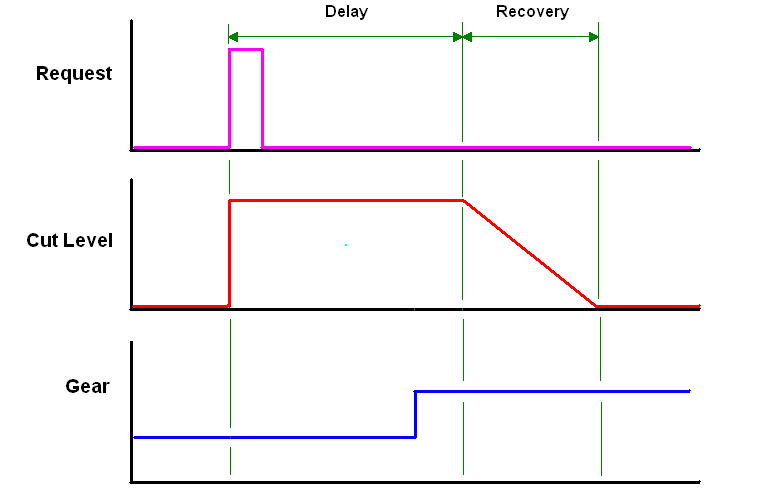This mode is only suitable when the ECU has a gear position input. The ignition cut starts as soon as a valid shift signal is detected and will hold for however long it takes for the gear position pot or gear calculation to detect the next gear has been reached or the Minimum RPM or Minimum Throttle Position have been reached. The Delay time starts when the new gear is detected to allow time for full engagement then the ignition is phased back in linearly over the recovery time.
