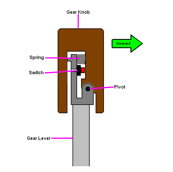The diagram below shows a basic example of a “double jointed” gear knob for a sequential gearbox where GCIC is only needed on the up shift. The knob is able to pivot for a short distance on the gear lever when pulled towards the rear; this activates the switch giving the ECU its GCIC request. It is recommended that the spring be adjustable for preload so that the correct amount of force can be applied before the GCIC function is started.