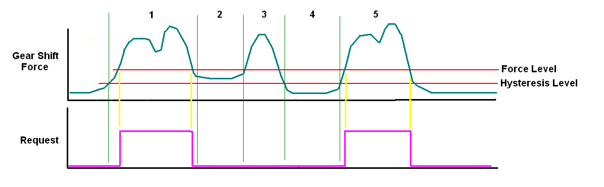 The actual force due to the Hysteresis setting is Gear Cut Force High minus the Gear Cut Force Hysteresis or Gear Cut Force Lo plus Gear Cut Force Hysteresis. For example: If the resting force of a gear lever in a standard H pattern gear box is 20 and the Gear Cut Force Low is 10, to make a 3rd to 4th shift the driver must push the gear lever forward (causing compression in the strain gauge) until the force drops from 20 to just below 10 to activate the request. If the Hysteresis is 3 the driver must let the gear lever force reading increase to 13 before another shift is able to be made. On a shift from 4th to 5th the strain gauge reading will increase above the resting force of 20, if the Gear Cut Force High is 30 the drive increase the force on the gear lever to this level and the next GCIC event starts, after this shift the Gear Force needs to drop to 27 before the next shift can be made.