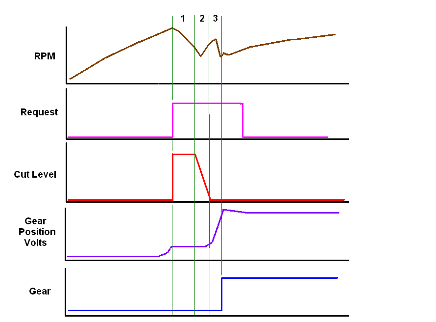 3. With no cut the driver has forced the gearbox into the next gear, this feels fast to the driver but can result in gearbox damage. The delay time should be increased.