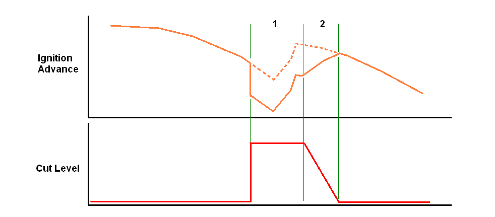 1. A GCIC cut event is started and the ignition is retarded by a set amount but stays relative to the normal ignition curve (dotted line).