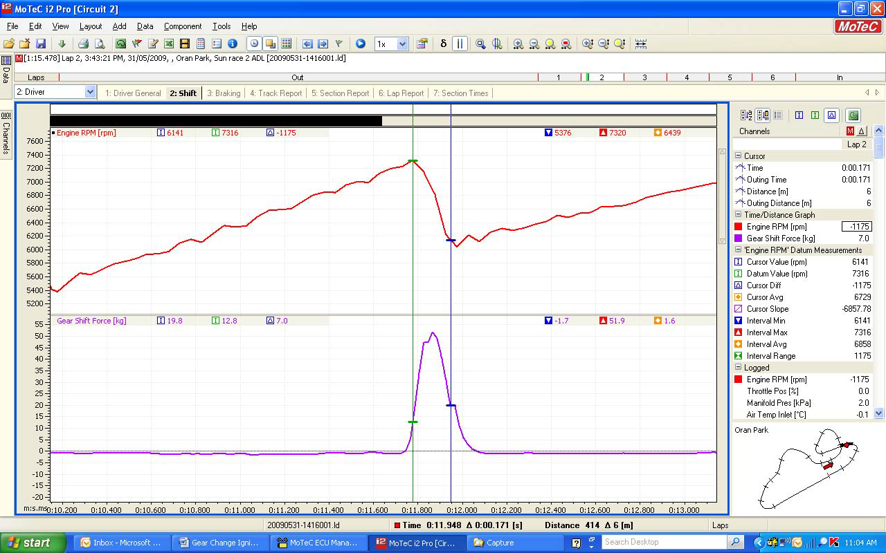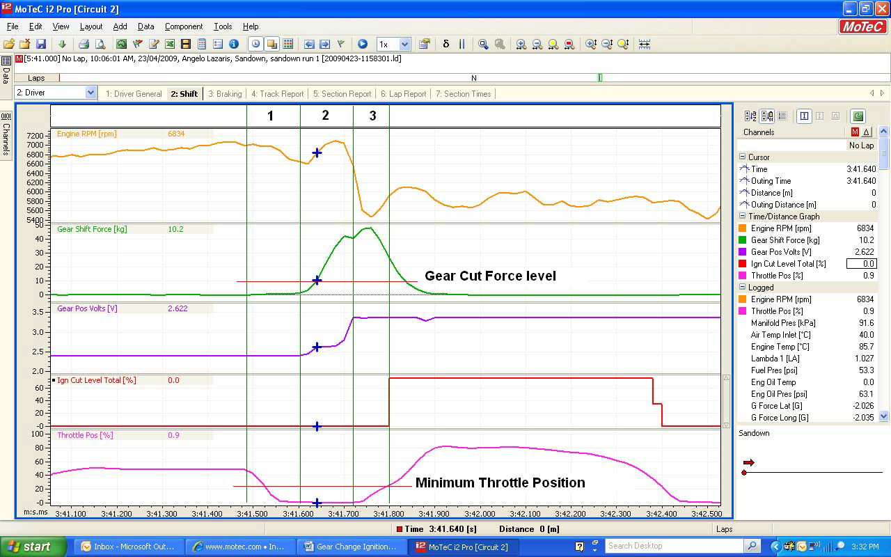 Below is an example of working out the basic shift time from data logging, in this case the gearbox is sequential and the time is 171 milliseconds, for an H pattern gearbox the times can be longer.
