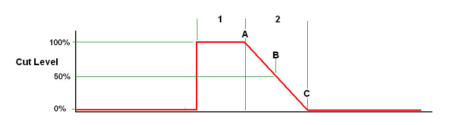 The cut level refers to the percentage of normal cylinder firing events that will be removed from the engine. The cut is quite literal in its meaning, the cylinder firing will be cut, the ignition advance (or timing) will remain the same but the cylinder will not be fired. 100% cut means that all cylinder firing events are stopped, 50% means half of them are stopped. The pattern in which the cylinders are cut is based on the main RPM Limit Randomizer.