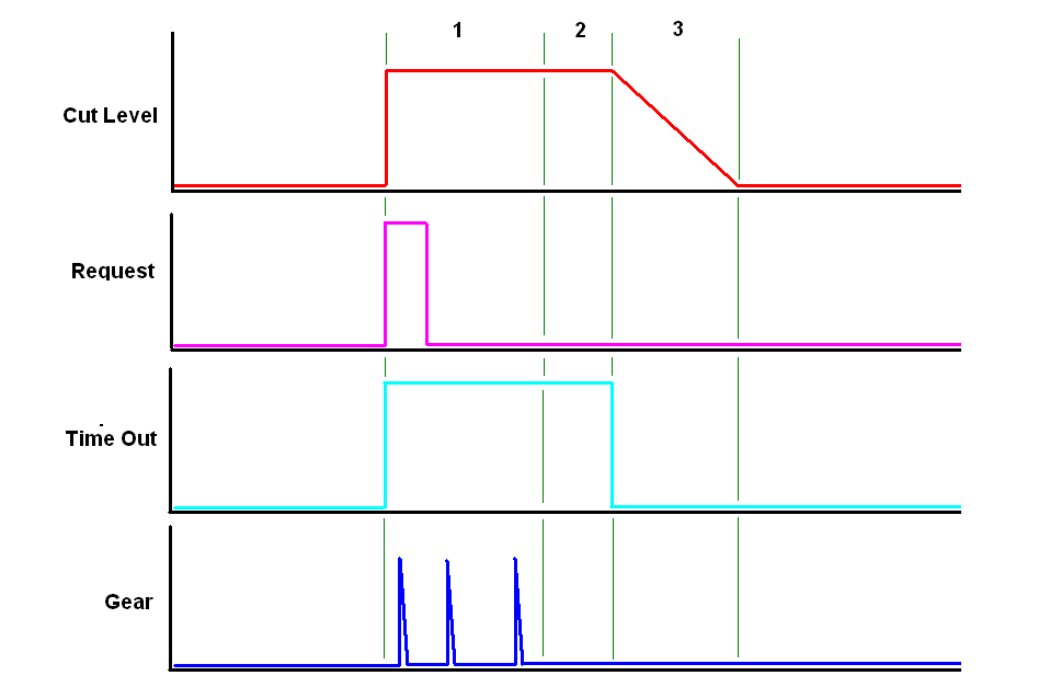 3. Because the driver is still holding enough force on the gear lever as the throttle is reapplied the cut starts. In this example the Mode was Delay from Next Gear Stable meaning that the cut is applied for the full Time Out because the driver triggered the GCIC request after the shift was made and not before.